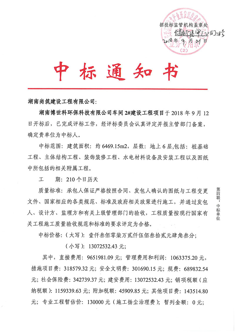 2018年9月12日,我公司中標(biāo)湖南博世科環(huán)??萍加邢薰镜能囬g2#建設(shè)工程,中標(biāo)金額1307.25萬元,工期210天,主要施工內(nèi)容包括樁基礎(chǔ)工程、主體結(jié)構(gòu)工程、裝飾裝修工程、水電材料設(shè)備及安裝工程以及附屬工程(具體見中標(biāo)通知書)。公司將按照合同要求的質(zhì)量標(biāo)準(zhǔn)優(yōu)質(zhì)高效完成該項(xiàng)目全部施工內(nèi)容。